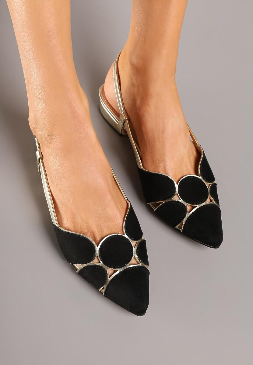• Design: Sandały posiadają modny, szpiczasty nosek oraz wycięcia ozdobione okrągłymi, złotymi elementami, które nadają im lekkości i oryginalności.