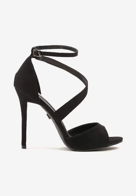Wykonane z przyjemnego w dotyku, imitującego zamsz materiału, sandały posiadają stylowe, skrzyżowane paski z przodu oraz cienki pasek z regulowaną sprzączką wokół kostki, co zapewnia idealne dopasowanie i stabilność. Odkryty nosek dodaje lekkości, a wysoka, smukła szpilka pięknie wydłuża nogi, gwarantując oszałamiający efekt.
