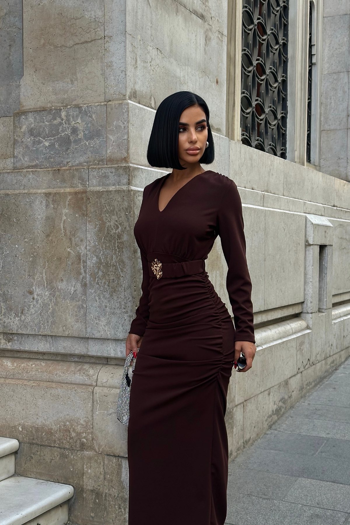 Odkryj esencję szyku z naszą sukienką midi w kolorze gorzkiej czekolady. Wykonana z przyjemnego, elastycznego materiału, idealnie dopasowuje się do sylwetki, podkreślając jej atuty.