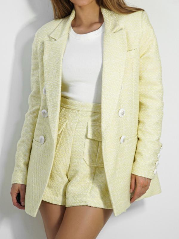 Ten wyjątkowy zestaw, wykonany z luksusowej tkaniny o strukturze tweed w pięknym, pastelowym odcieniu żółci, to kwintesencja szyku i klasy. Idealny na specjalne okazje, spotkania biznesowe czy eleganckie wyjścia.