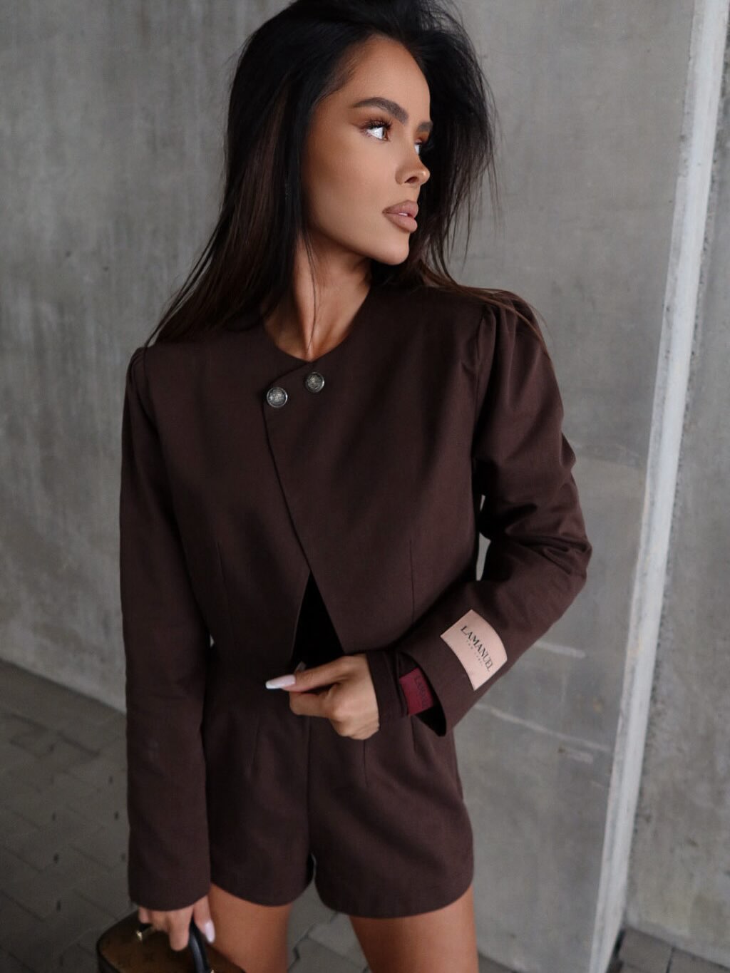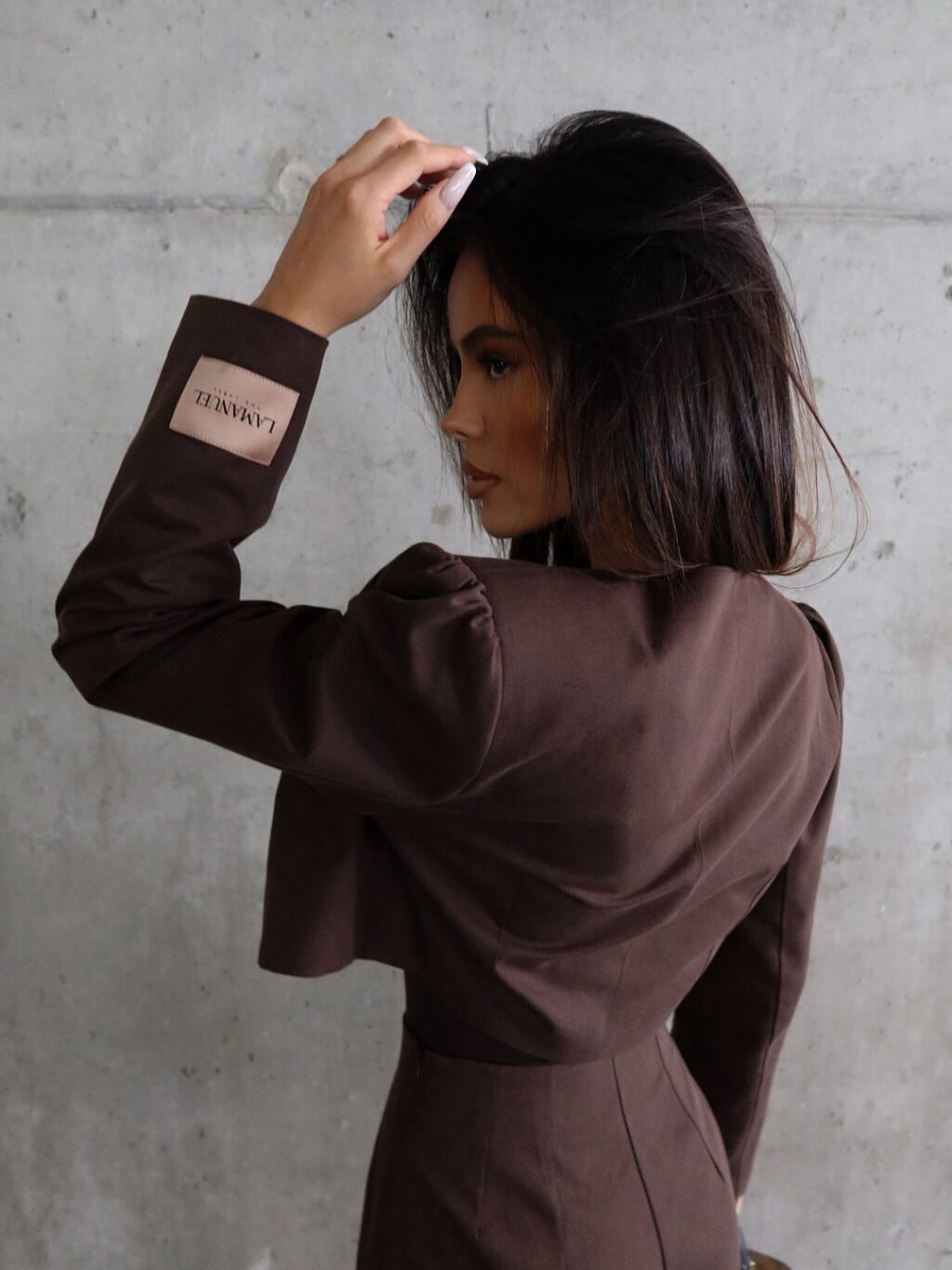 Odkryj nowy wymiar stylu z naszą nowoczesną, skróconą marynarką Spectrum w głębokim odcieniu czekolady. Ten wyjątkowy fason polskiej marki La Manuel łączy elegancję z casualową swobodą.